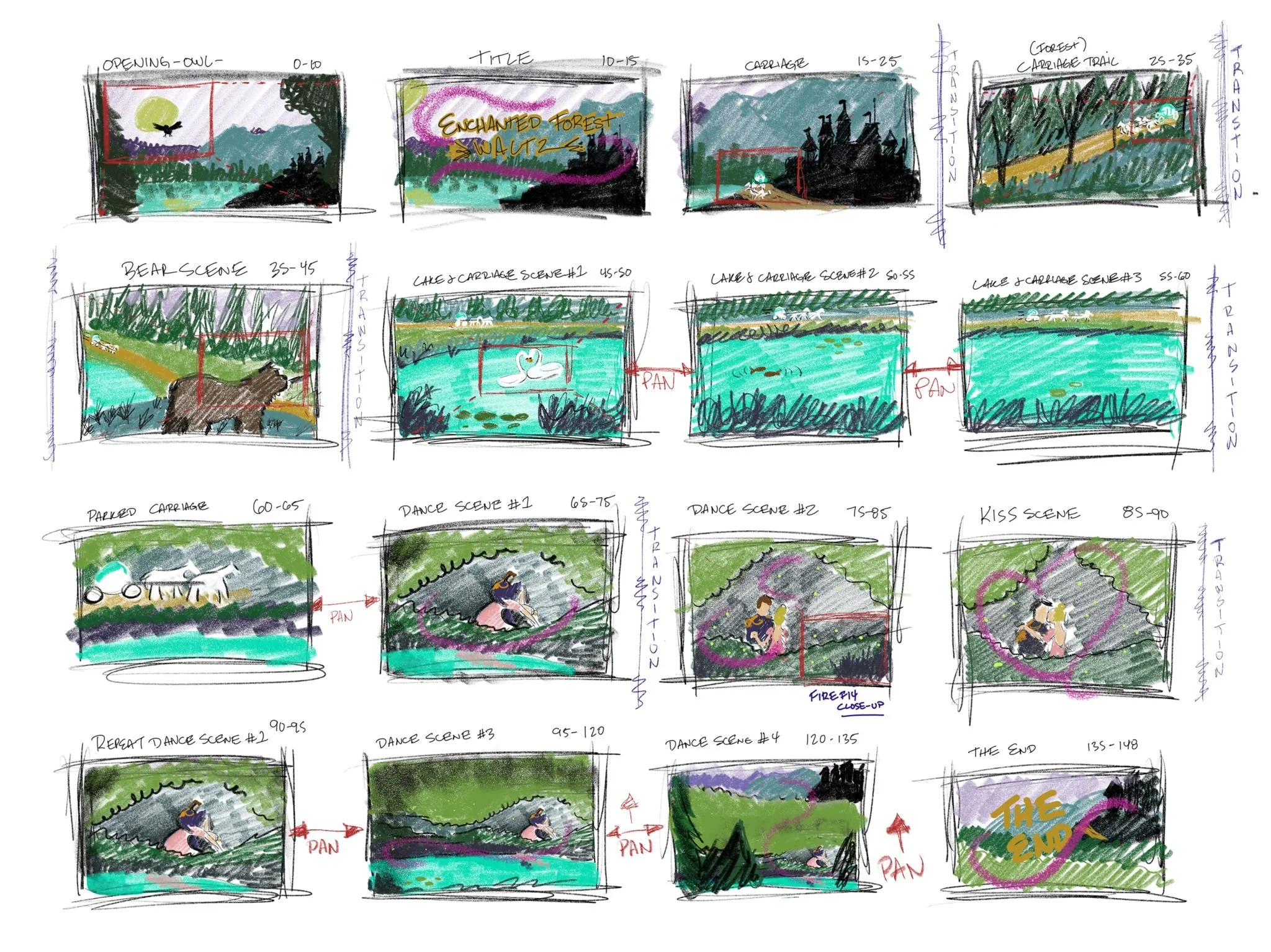 Each scene is digitally drawn, then animated frame by frame using various techniques including rotoscoping. Because the drawings are created digitally, often frames can be duplicated and subtle changes made to A SPECIFIC piece of the drawing that requires movement; This speeds up the process of animating. IN TOTAL THERE ARE HUNDREDS OF DIGITAL DRAWINGs THAT MAKE UP the ‘Enchanted Forest waltz’ SHORT, and the entire process took over 120 hours.